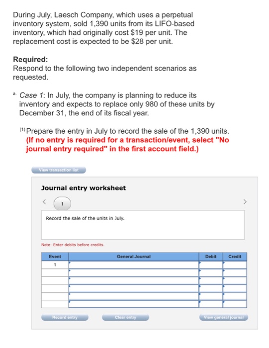 During July Laesch Company which uses a perpetual inventory system sold 1430 units from its LIFO-based inventory which had originally cost 16 per unit. LIFO Liquidation is an event occurring with the entities who are in the practice of using the LIFO Last in first out method method for cost of the inventories where the entity has to use older stocks acquired except the latest stock acquired due to a sudden increase in the market demand of the products and to full fill the demand the entity has to use. The replacement cost is expected to be 20 per unit Required.
